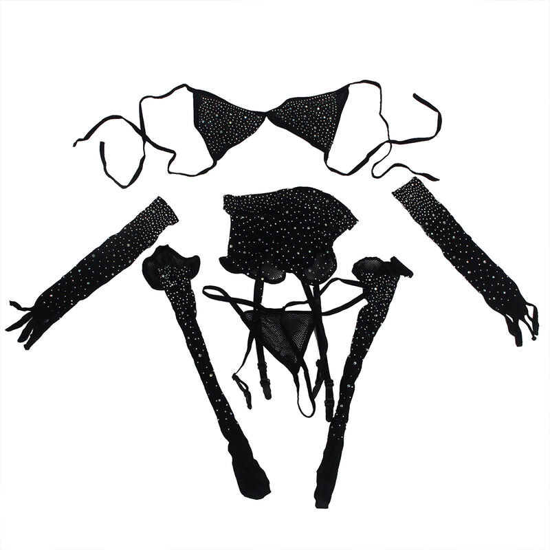 BODYSTOCKING DE REDE COM LUVAS E DIAMANTES PRETO TAMANHO ÚNICO