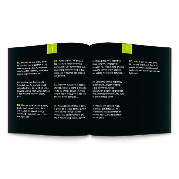 Os 24 desafios da edição Foreplay estão disponíveis em 10 idiomas: inglês, espanhol, francês, alemão, holandês, polonês, russo, italiano, sueco e norueguês, e certamente o levarão a um clímax que você nunca experimentou antes. Você é travesso o suficiente para mergulhar? Surpreenda-se, entusiasme-se e se sinta atraído e, acima de tudo, aproveite para curtir um ao outro. Diverte-te!